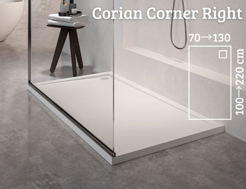 Design shower tray, with angled water drainage, siphon in the right corner at 13 x 13 cm, in mineral resin from Corian ® DuPont Nemours ®, smooth matt white Glacier finish, made to measure. 10 YEAR WARRANTY.