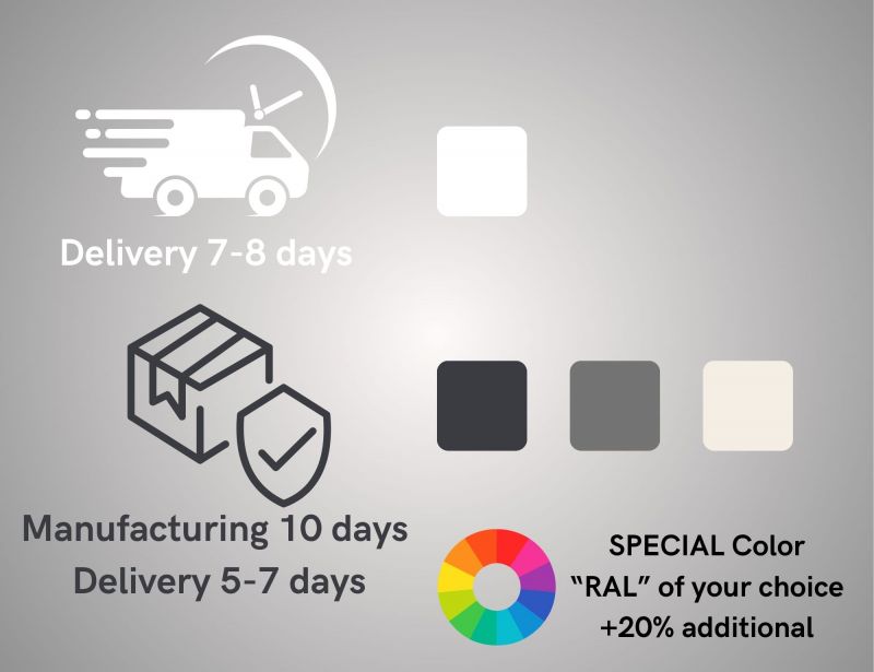 Other colours: 10 days production + 5-7 days delivery