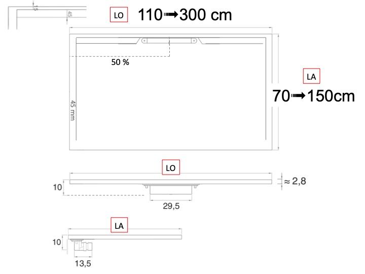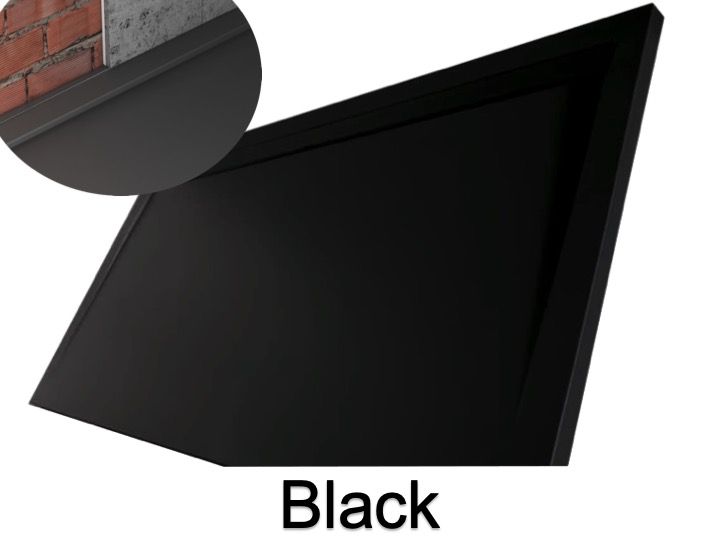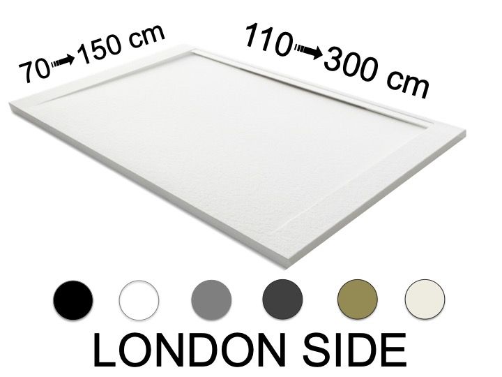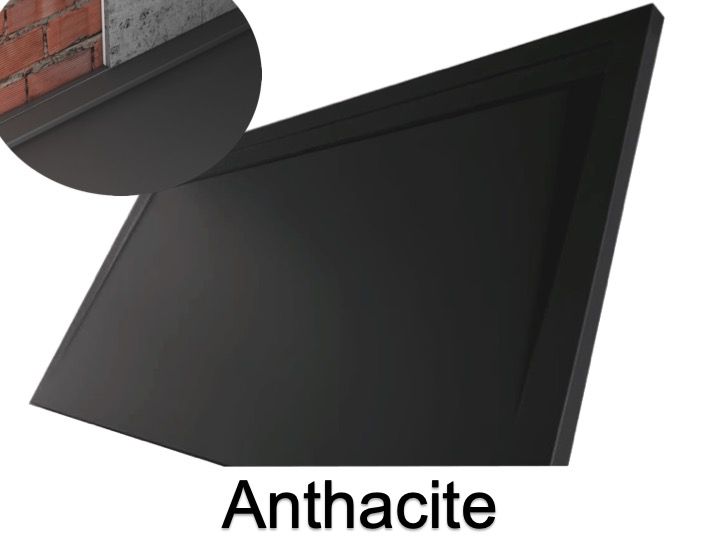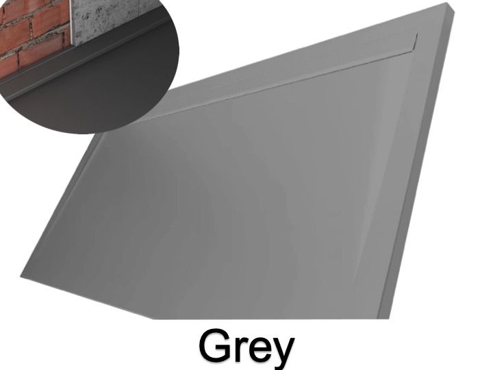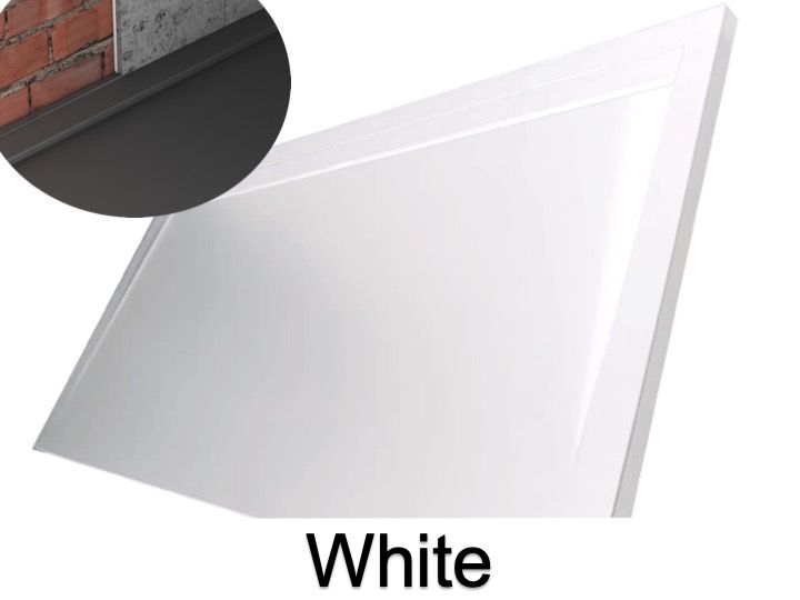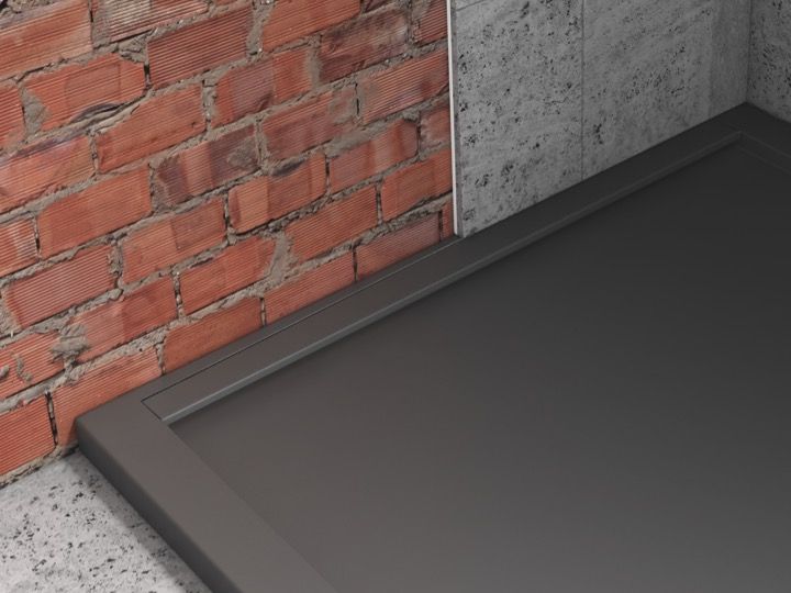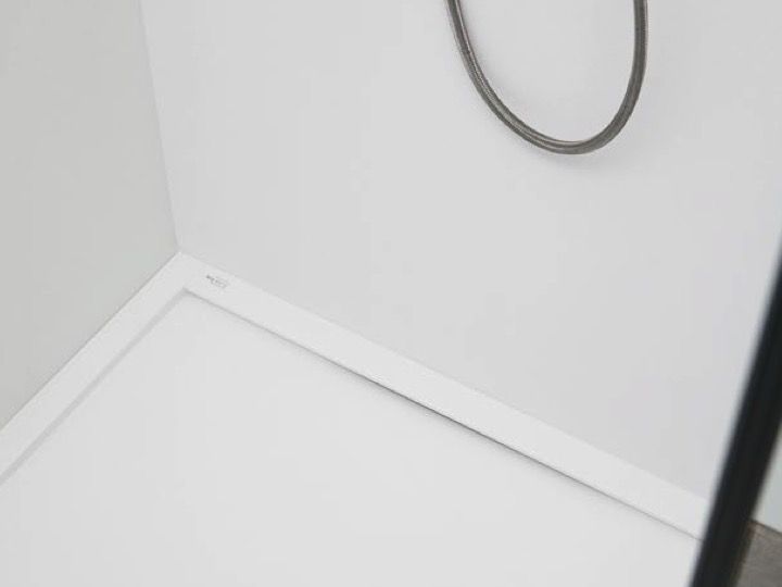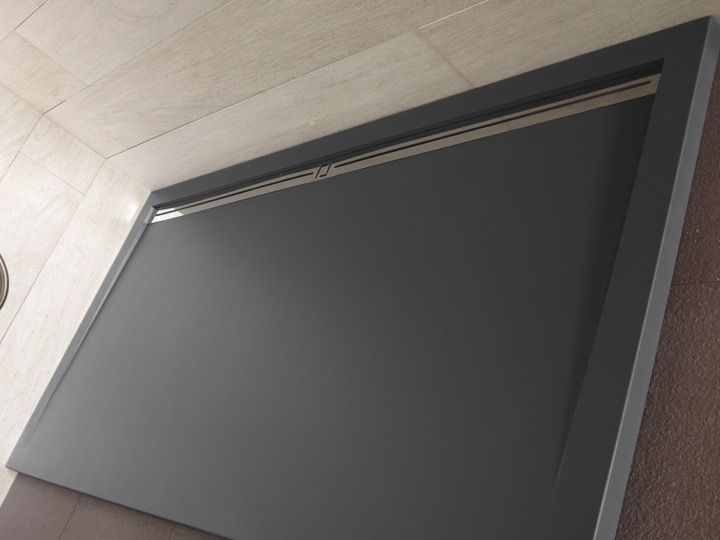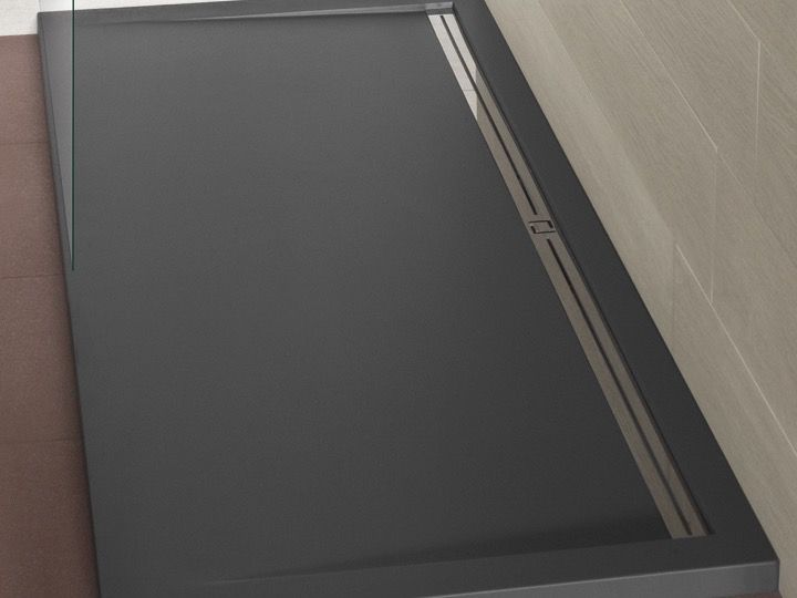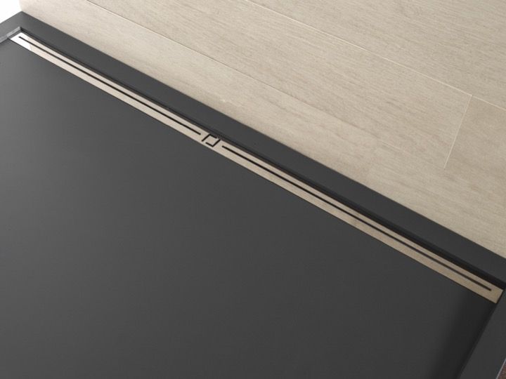 Shower tray, with a designer channel, with discreet drain, in Akrytan® mineral resin, custom made, smooth finish.