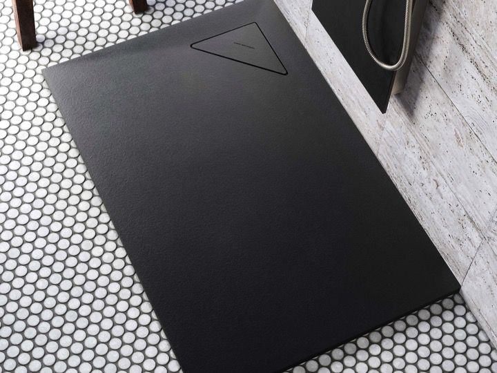Designer shower tray, with corner water drain, siphon in the right corner at 17 x 17 cm, slate effect, non-slip.