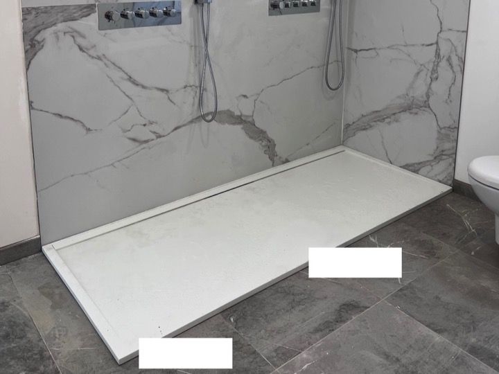 Shower tray, with a designer channel, with discreet drain, in Akrytan® mineral resin, custom made, smooth finish.