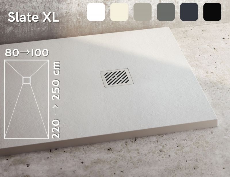 SLATE XL resin shower trays are made from an alloy of resins and mineral fillers. The textured, non-slip surface adds an extra touch to any bathroom. They can be customised in terms of dimensions, large sizes and colour. And they're only three centimetres high, to make access to the shower area easier for people with reduced mobility. When choosing resin shower trays.