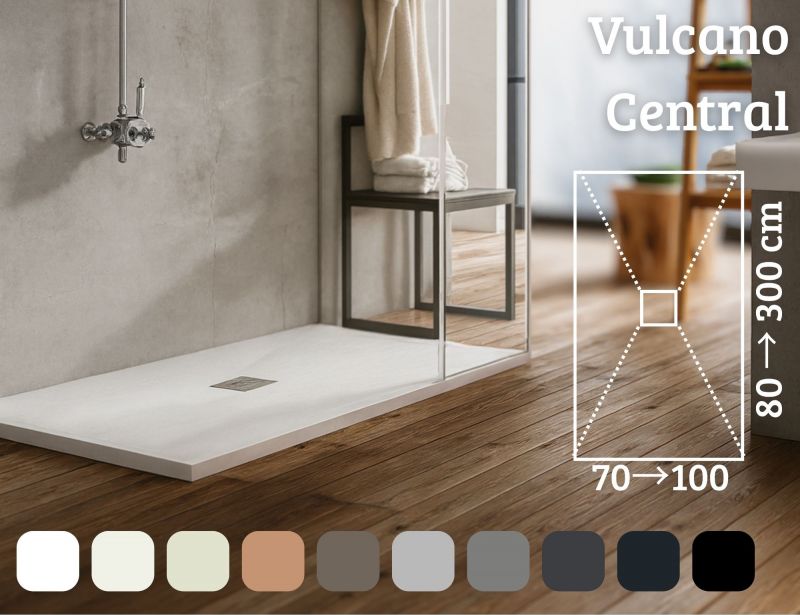 Shower trays with central drain, made of mineral resin, made to measure, stone effect, non-slip.