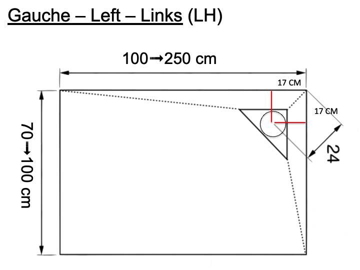 Designer shower tray, with corner water drain, siphon in the right corner at 17 x 17 cm, slate effect, non-slip.