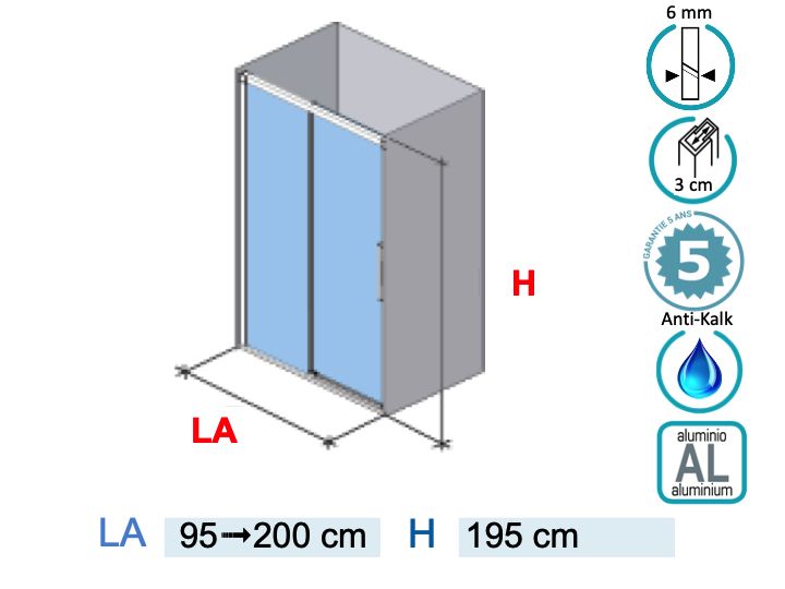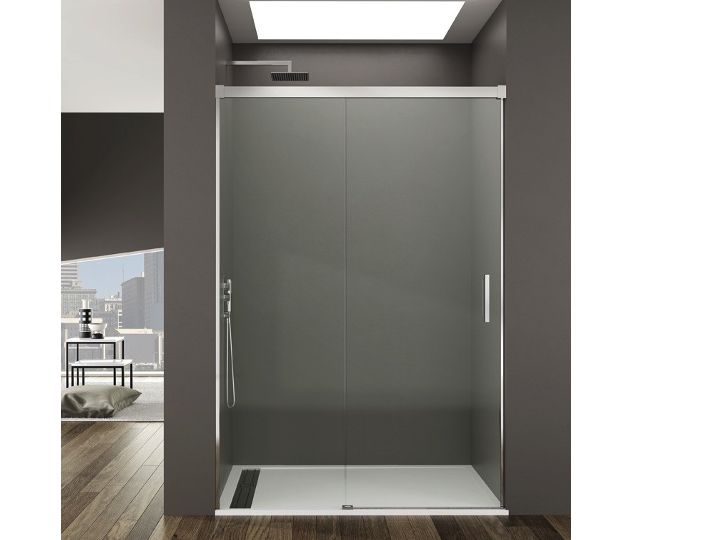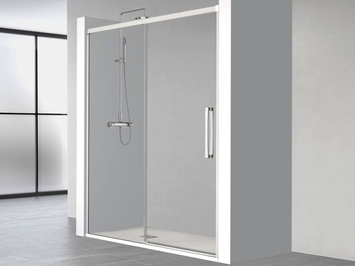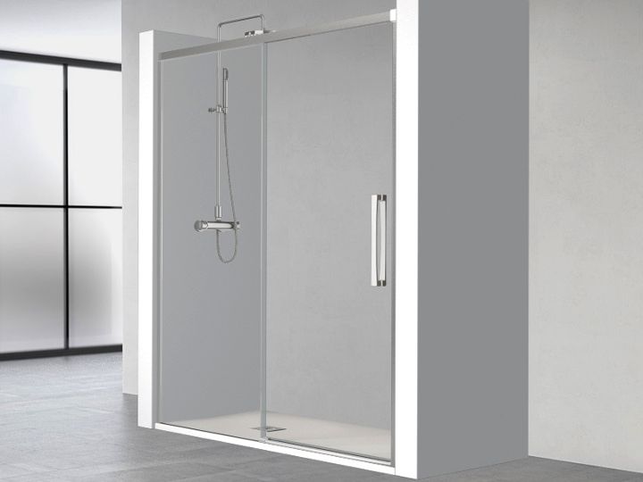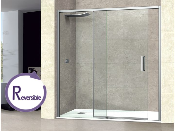 Sliding shower door, installation in niche, composed of a sliding door and a fixed panel, reversible.