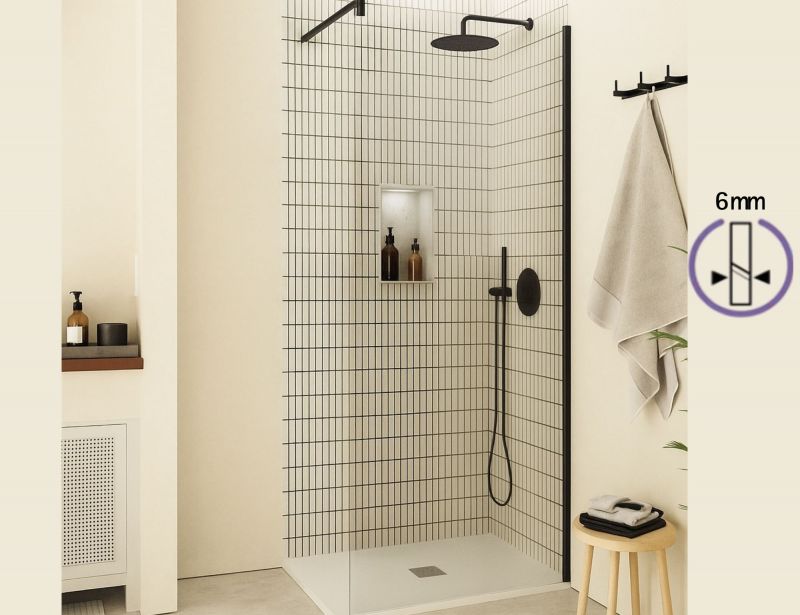 The black aluminum wall profile adds a sleek, modern touch while allowing for a +10 mm wall adjustment for a perfect fit even on uneven walls.