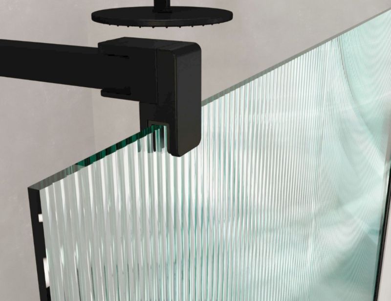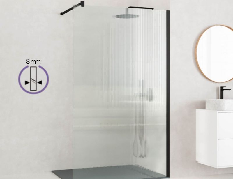 Fixed walk-in shower screen with 8 mm wavy textured safety glass, Teknoclean anti-limescale treatment, black wall profile, stabilizing bar included, reversible, height 195 cm, 5-year warranty. Free delivery within 8 to 10 days.