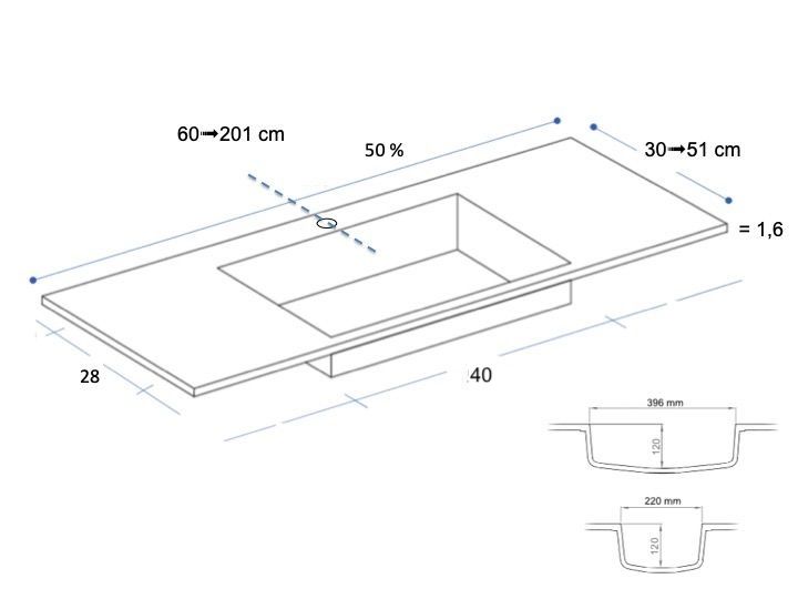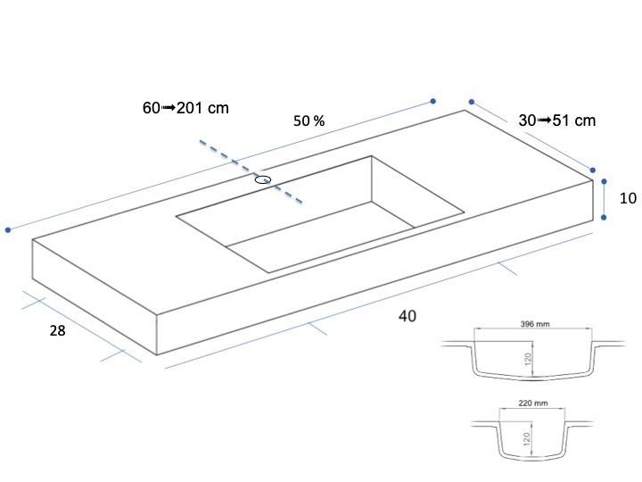 The location of the basin on the plan can be modified, as well as the tap hole. The size of the pool cannot be changed.